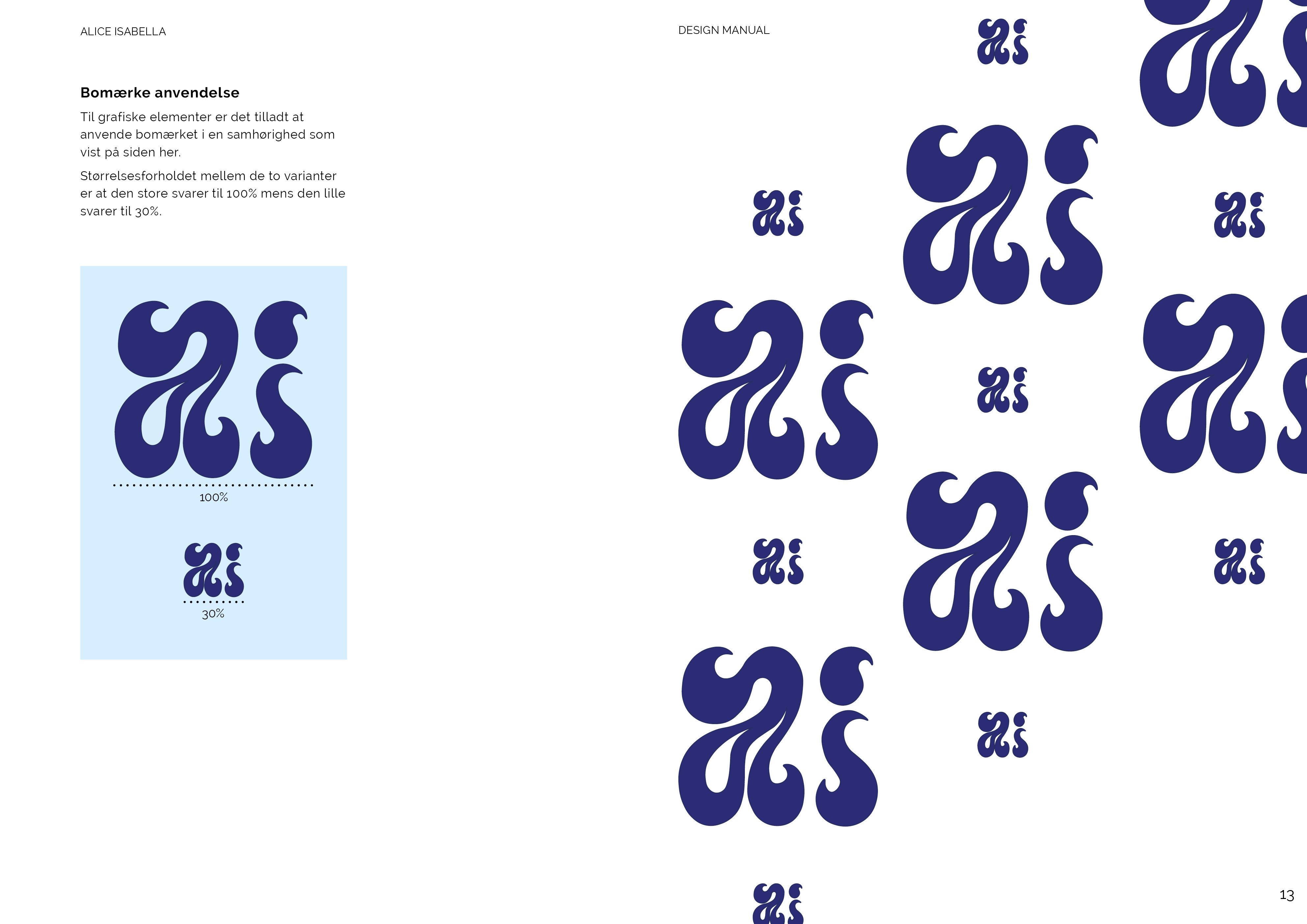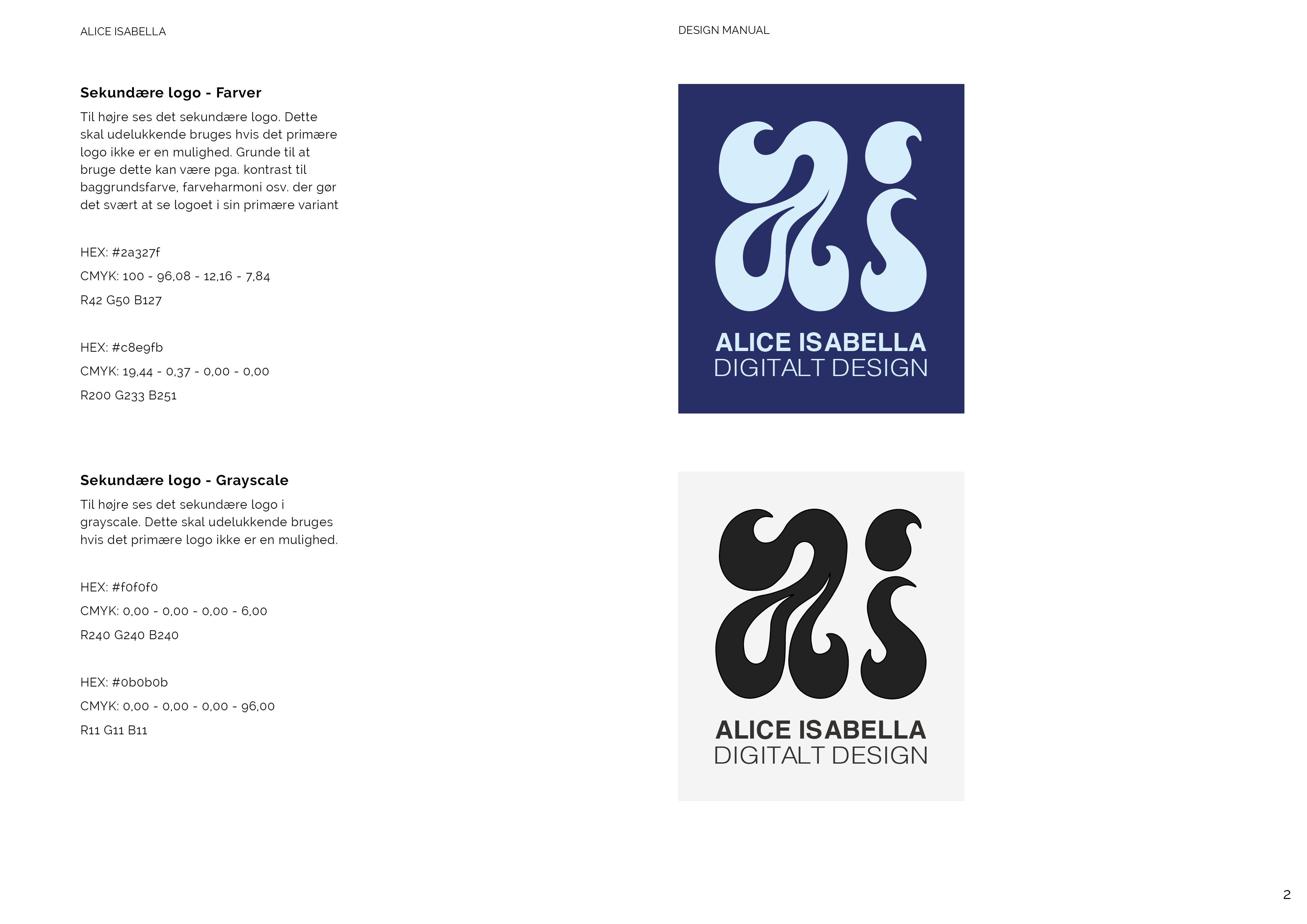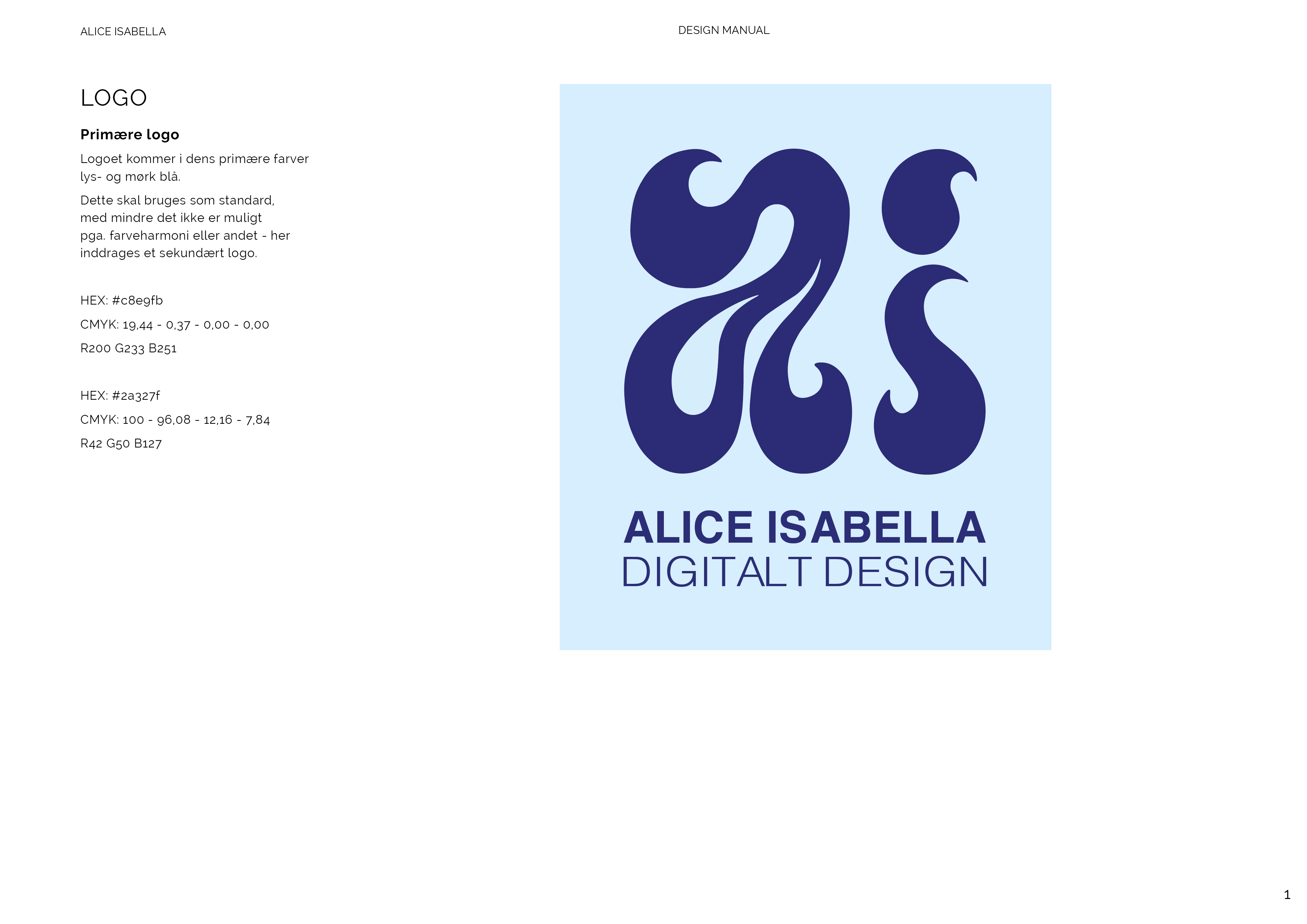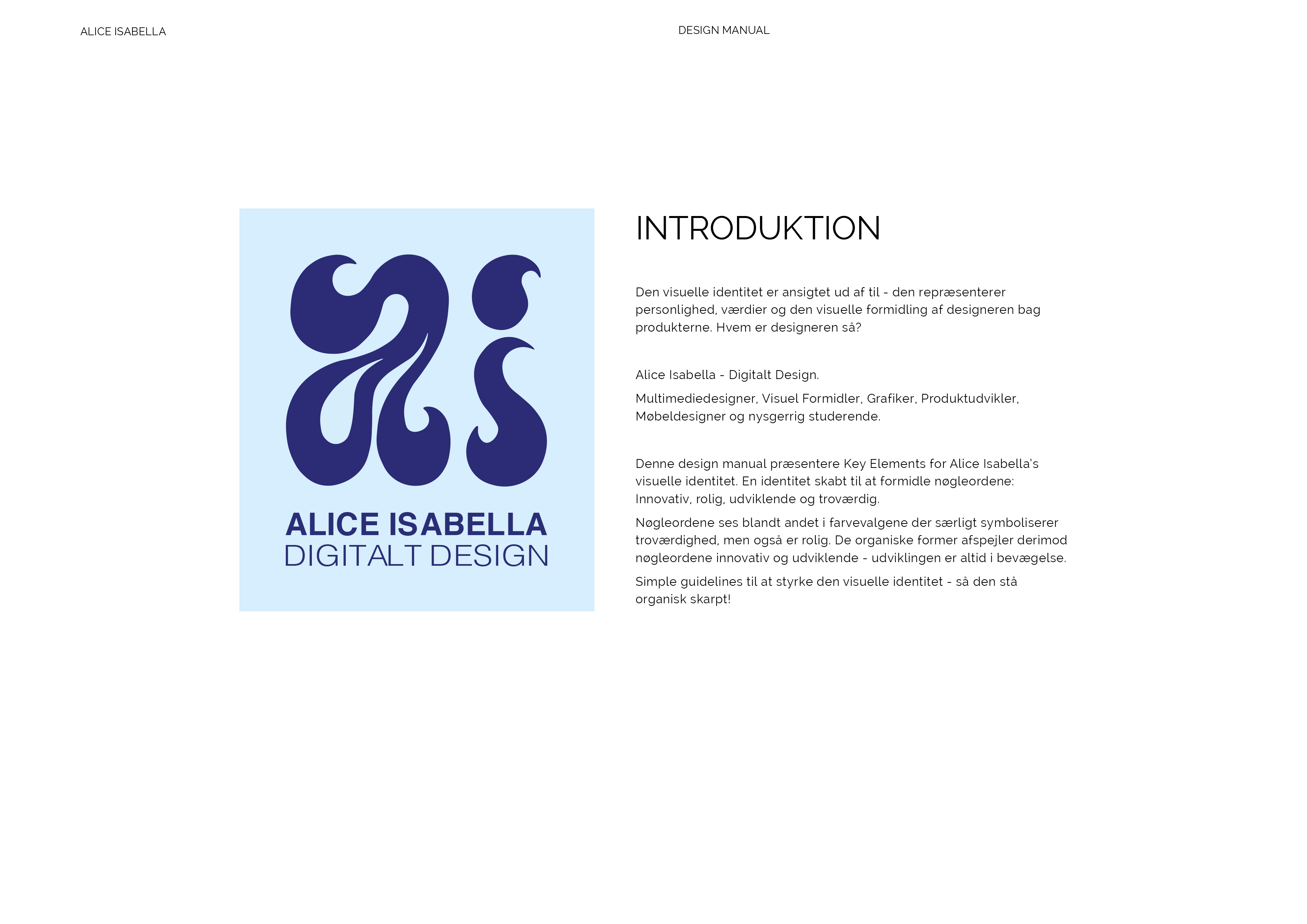 PORTFOLIO Designmanual - Alice Isabella Digitalt Design OpgavebeskrivelseStudieprojekt. Med fokus i emnet “Personlig branding” er denne designmanual udviklet for min personlige under Alice Isabella Digitalt Design. Herunder er ligeledes udviklet et logo til den tilhørende design identitet. Årstal2024Programmer brugtAdobe Illustrator, InDesign Designmanual – Slideshow