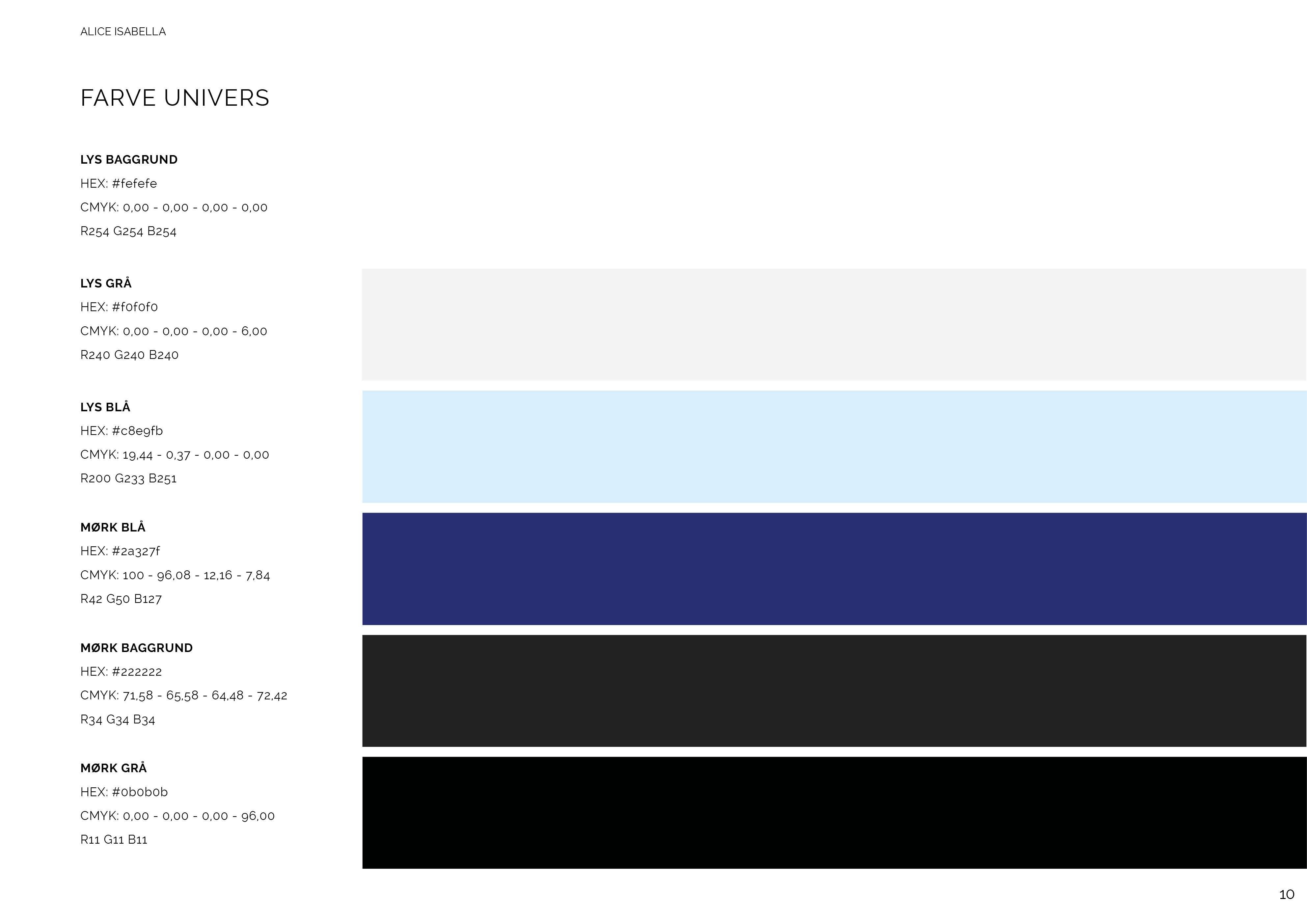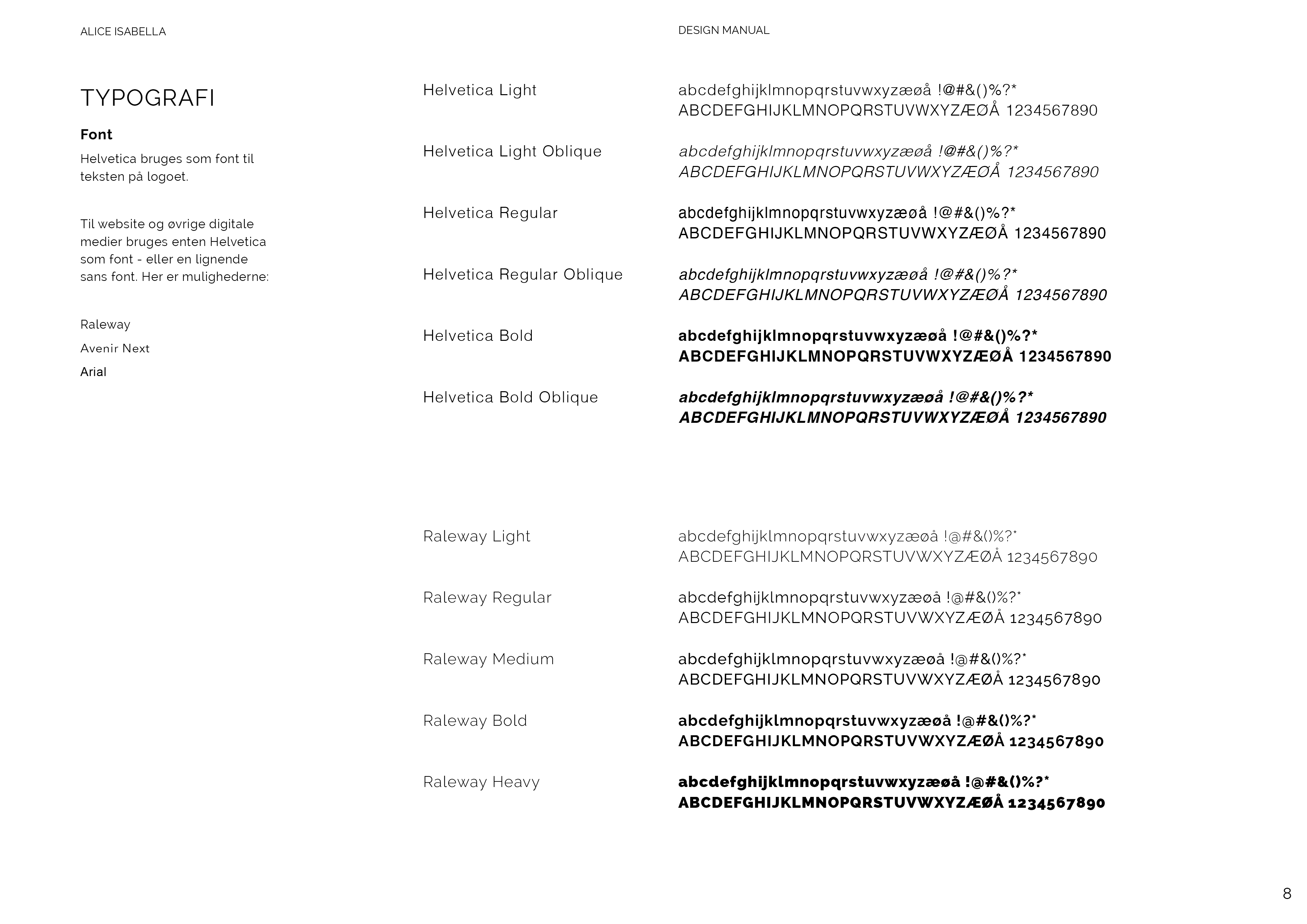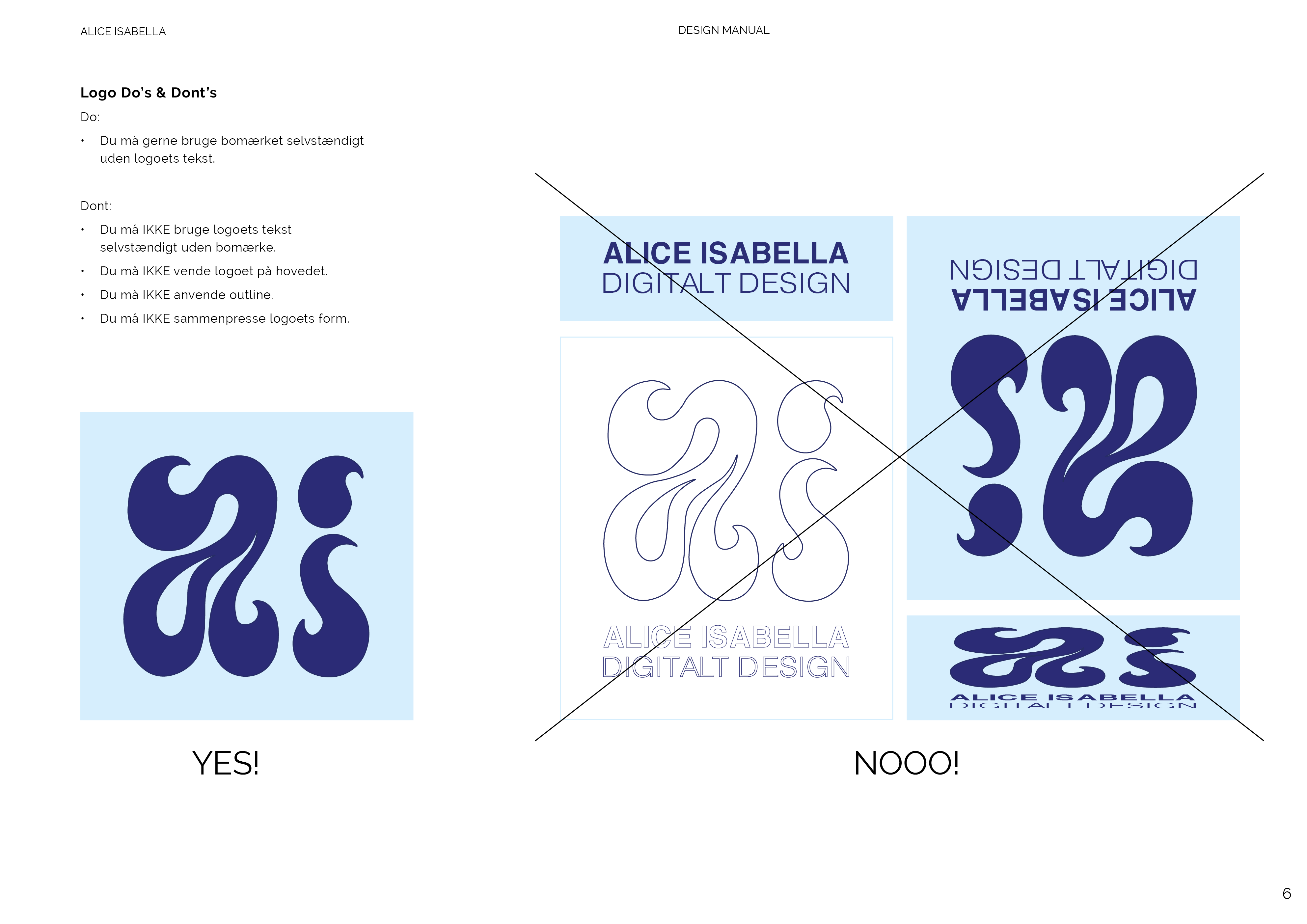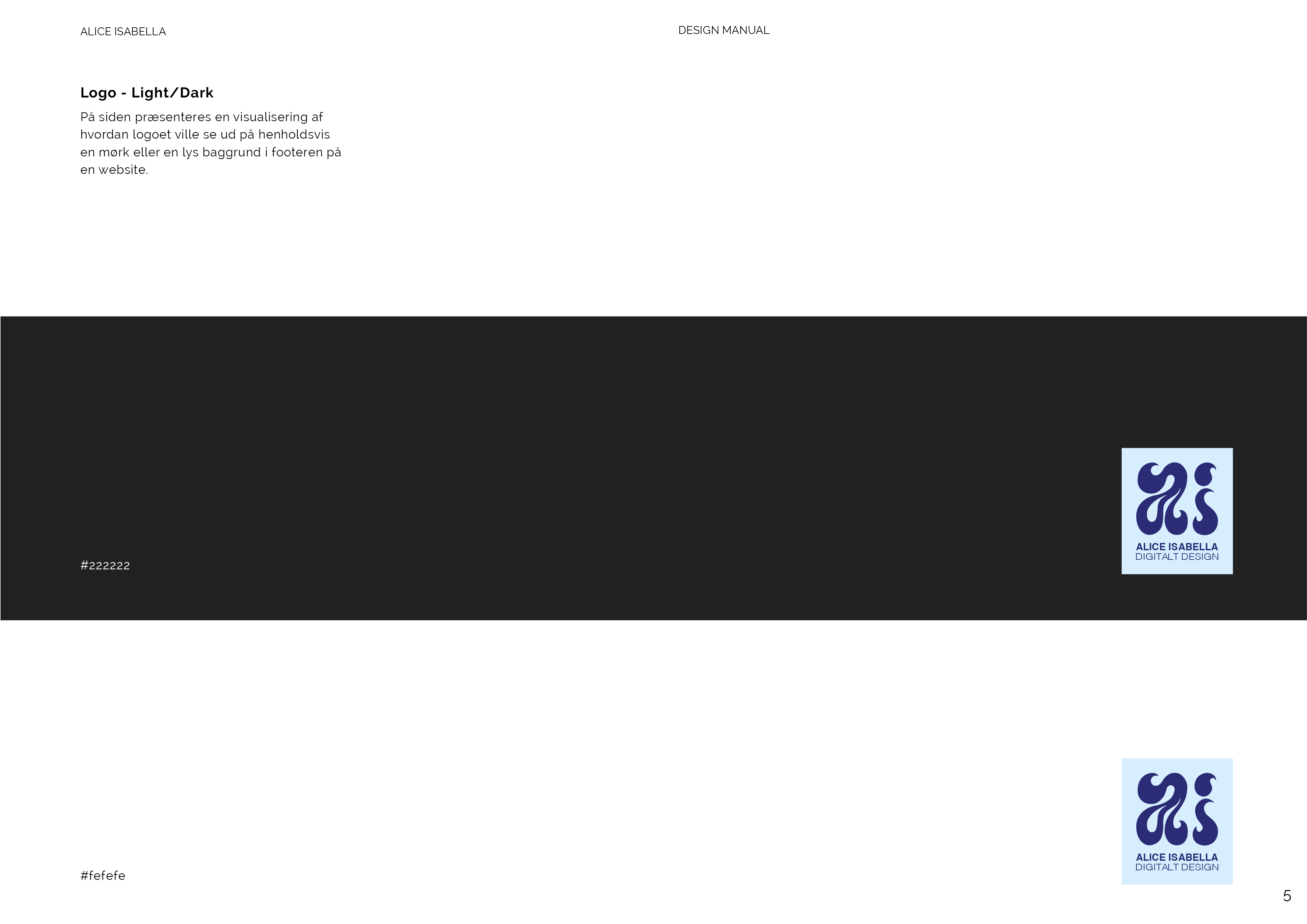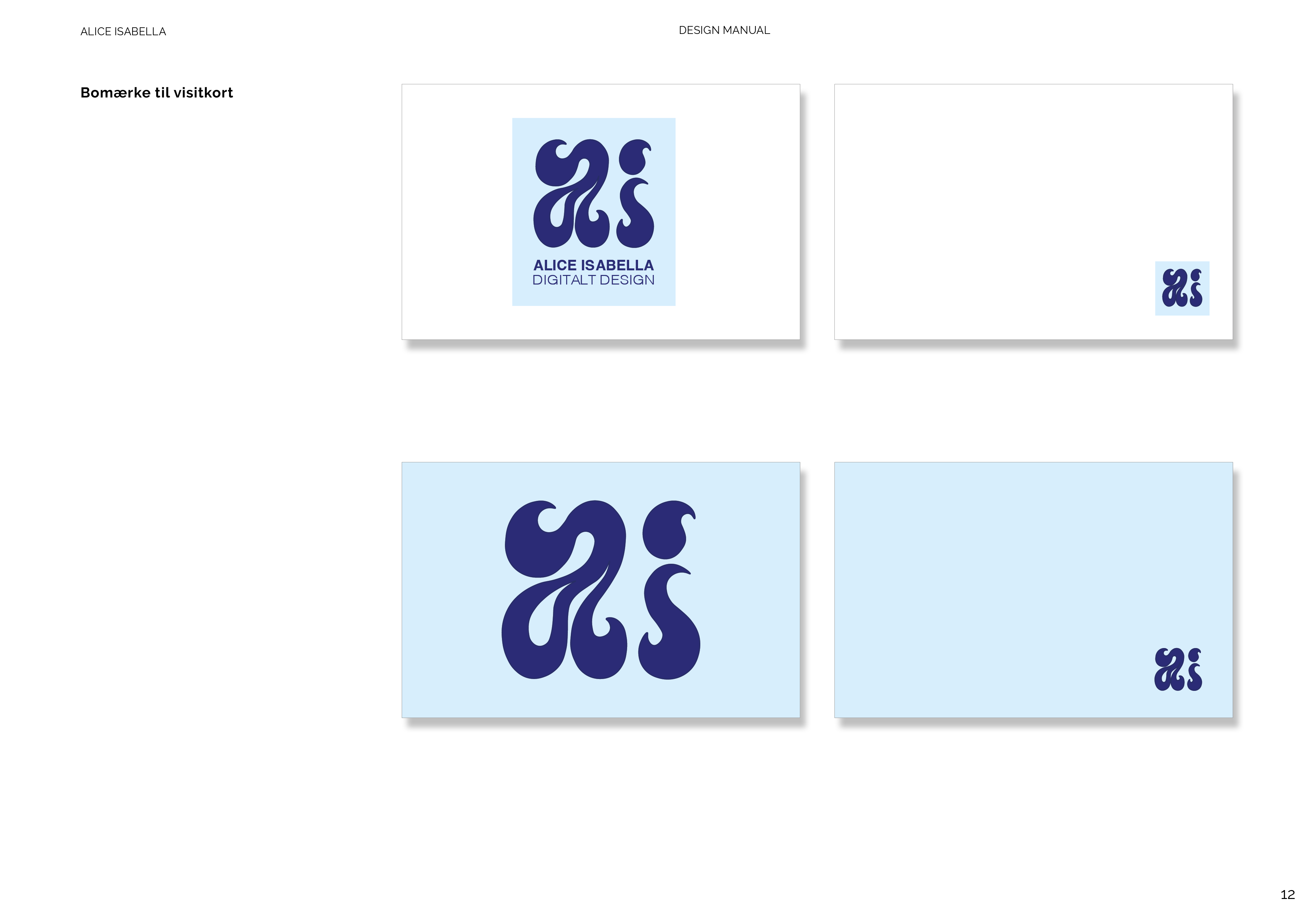 PORTFOLIO Designmanual - Alice Isabella Digitalt Design OpgavebeskrivelseStudieprojekt. Med fokus i emnet “Personlig branding” er denne designmanual udviklet for min personlige under Alice Isabella Digitalt Design. Herunder er ligeledes udviklet et logo til den tilhørende design identitet. Årstal2024Programmer brugtAdobe Illustrator, InDesign Designmanual – Slideshow